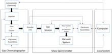 Gas chromatography-mass spectrometry (GC-MS) is a two-dimensional chromatography technique that combines the separation technique of gas chromatography with the identification technique of mass spectrometry. GC-MS is the single most important analytical tool for the analysis of volatile and semi-volatile organic compounds in complex mixtures.[7] It works by first injecting the sample into the GC inlet where it is vaporized and pushed through a column by a carrier gas, typically helium. The analytes in the sample are separated based upon their interaction with the coating of the column, or the stationary phase, and the carrier gas, or the mobile phase.[8] The compounds eluted from the column are converted into ions via electron impact (EI) or chemical ionization (CI) before traveling through the mass analyzer.[9] The mass analyzer serves to separate the ions on a mass-to-charge basis. Popular choices perform the same function but differ in the way that they accomplish the separation.[10] The analyzers typically used with GC-MS are the time-of-flight mass analyzer and the quadrupole mass analyzer.[8] After leaving the mass analyzer, the analytes reach the detector and produce a signal that is read by a computer and used to create a gas chromatogram and mass spectrum. Sometimes GC-MS utilizes two gas chromatographers in particularly complex samples to obtain considerable separation power and be able to unambiguously assign the specific species to the appropriate peaks in a technique known as GCxGC-(MS).[11] Ultimately, GC-MS is a technique utilized in many analytical laboratories and is a very effective and adaptable analytical tool.