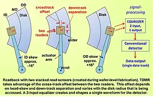 Two-dimensional magnetic recording (TDMR) is a technology introduced in 2017 in hard disk drives (HDD) used for computer data storage. Most of the world's data is recorded on HDDs, and there is continuous pressure on manufacturers to create greater data storage capacity in a given HDD form-factor and for a given cost. In an HDD, data is stored using magnetic recording on a rotating magnetic disk and is accessed through a write-head and read-head (or read-element). TDMR allows greater storage capacity by advantageously combining signals simultaneously from multiple read-back heads to enhance the recovery of one or more of data-tracks. In this manner, data can be stored with higher areal-density on the disks thus providing higher capacity in each HDD.[1][2][3] TDMR is a read-back technology and thus applies equally well to future recording (writing) technologies such as Heat-Assisted Magnetic Recording (HAMR) and Microwave-Assisted Magnetic Recording (MAMR).[4]