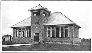 A two-room schoolhouse in Osgood, Ohio, designed by architect C. F. Bowdle of Piqua, Ohio, was cited in the October 1914 issue of Building Age magazine as an example of a "modern" school. To meet state building codes, the entire foundation and exterior walls are made of masonry, with a roof of asbestos shingles. The simple design includes two 31 ft × 38 ft (9.4 m × 11.6 m) classrooms separated by the vestibule and coat rooms. This design included a rear vestibule and exit for each classroom.[3]: 29-32