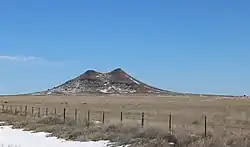 Two Buttes is a dual-peaked mountain in Prowers County, Colorado. The two peaks, which are the highest point in Prowers County, rise about 300 feet (91 m) above the mostly flat Great Plains that surround them, making them visible for miles. The south peak is about 30 feet (9.1 m) higher than the north one, and both are connected by a saddle.[3]