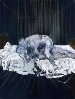 The painting depicts two naked men grappling with each other on a disarrayed bed. One man is astride and gripping the second, lying on his side and exclaiming in agony or perhaps ecstasy. The figures and the bed are painted in light shades of white, blue, pink and lilac on a deep blue background, blurred as if in motion. Apart from the men and the bed, with the bed's brown head and foot boards to either side, the painting is set in an otherwise a featureless and windowless space demarcated by a frame of white lines, and veiled behind a series of vertical lines like a sheer curtain. The composition was based on a motion series of photographs of men wrestling published by Eadweard Muybridge in the 1880s, although that ostensible explanation is often seen as a cover for a depiction of a sadomasochistic homosexual encounter between men who resemble Bacon with his violent lover Peter Lacy on top.