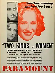 Two Kinds of Women is a 1932 American pre-Code drama film directed by William C. deMille, written by Benjamin Glazer, adapted from the play by Robert E. Sherwood, and starring Miriam Hopkins, Phillips Holmes, Irving Pichel, Wynne Gibson, Stanley Fields and Vivienne Osborne. It was released on January 16, 1932, by Paramount Pictures.[1][2]