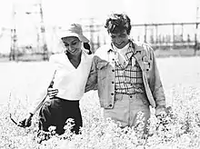 The filming of Two for the Road began on 3 May 1966, the day before Hepburn's 37th birthday. At the time, Hepburn's marriage to Mel Ferrer was breaking down. During the production she went to France alone while Ferrer elected to remain in Tolochenaz with their son, Sean Ferrer, and negotiate the production of Wait until Dark. Donen noted of Hepburn that "she was very strung up as we began filming. It was Albert who helped put her at ease."[22] Finney, who came from a Northern working-class background, was in many ways the antithesis of the aristocratic Hepburn and was able to draw out a previously unseen side of her personality. As filming went on, the two became increasingly close and spent much of their time together outside of work, going out to eat and dance in the evenings.[23] Finney later reflected on their relationship, explaining, "doing a scene with her, my mind knew I was acting but my heart didn't, and my body certainly didn't! Playing a love scene with someone as sexy as Audrey, you sometimes get to that edge where make-believe and reality are blurred. [...] The time spent with Audrey is one of the closest I've ever had."[24] Finney regularly teased Hepburn, calling her "tawdry Audrey" and "Audrey Sunburn."[25] Author Irwin Shaw, who visited the set, said of Hepburn, "she and Albie had this wonderful thing together, like a pair of kids with a perfect shorthand of jokes and references that closed out everybody else. It was like a brother and sister in their teens. When Mel was there, Audrey and Albie got rather formal and a little awkward, as if now they had to behave like grown ups."[26]