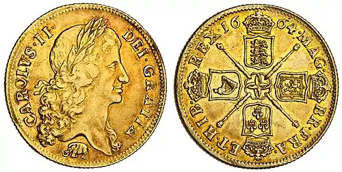 The two guinea piece was a gold coin first minted in England in 1664 with a face value of forty shillings. The source of the gold used, also provided the coin its name - the "guinea", with the regular addition of an elephant or castle symbol on the earliest issues to denote bullion supplied by the Royal African Company. For most of its period of production, the coin weighed between 16.7 and 16.8 grams and was 31-32 millimetres in diameter, although the earliest coins of Charles II were about 0.1 grams lighter and 1 millimetre smaller.