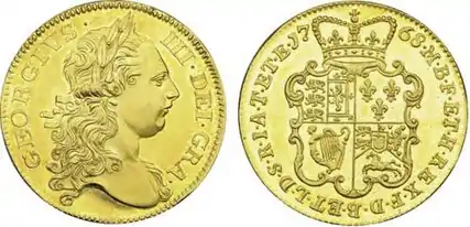 No currency issue Two Guinea coins were struck during George III's reign, however the Royal Mint still engaged in the production of proofs and patterns of the denomination in anticipation of future coinage. As a result, the then Chief Engraver John Sigismund Tanner produced trials of the intended coin for 1768, 1770 and 1773, and latterly his assistant Richard Yeo created a trial coin for 1777. All were created in small quantities and are now extremely sought after by collectors. The present auction record for a Two Guinea, either currency issue or proof is held by an example of the 1768 Pattern, which sold for over £120,000 in New York in January 2014.[2]