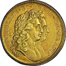 With the removal of James II in the Glorious Revolution of 1688, his daughter Mary, and her husband Prince William of Orange ruled jointly by agreement as co-monarchs. Their heads appear conjoined on the two guinea piece in Roman style, with William's head uppermost, with the legend GVLIELMVS ET MARIA DEI GRATIA. In a departure from the previous reigns the reverse featured a totally new design of a large crowned shield which bore the arms of France in the first quarter, of Scotland in the second quarter, of Ireland in the third quarter, and of England in the fourth quarter, the whole ensemble having a small shield in the centre bearing the rampant lion of Nassau; the legend on the obverse read MAG BR FR ET HIB REX ET REGINA date. The weight tolerance of the coin in this reign was 16.7-16.8 grams. The two guinea coin of this reign was probably the work of James and/or Norbert Roettier and, apart from a rare issue in 1691, it was only produced in 1693 and 1694.