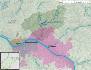 Twomile Creek is a tributary of the Kanawha River, 4.7 miles (7.6 km) long,[5] in West Virginia in the United States. Via the Kanawha and Ohio rivers, it is part of the watershed of the Mississippi River, draining an area of 24.4 square miles (63 km2)[6] on the unglaciated portion of the Allegheny Plateau, in the city of Charleston and its vicinity.