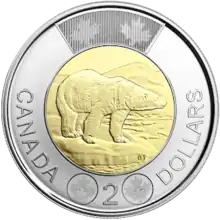 The toonie (also spelled twonie[1][2] or twoonie[3][4]), formally the Canadian two-dollar coin (French: pièce de 2 dollars canadiens, nicknamed deux piastres or deux piastres rond), was introduced on February 19, 1996, by Minister of Public Works Diane Marleau. As of 2023, it possesses the highest monetary value of any circulating Canadian coin. The toonie is a bi-metallic coin which on the reverse side bears an image of a polar bear by artist Brent Townsend. The obverse, like all other current Canadian circulation coins, has a portrait of Queen Elizabeth II. It has the words ELIZABETH II / D.G. REGINA in a typeface different from any other Canadian coin.