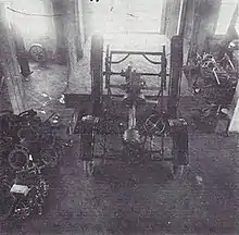 A reporter from the Jeffersonian Democrat visited the factory on May 12, 1905. He found fifteen men busy at work, with several cars in various stages of construction. The factory produced all the parts for the car, except for the wheels, tires and lamps. Robert Twyford himself supervised the chassis and engine shop, along with C. A. French. Ralph Reitz supervised the body shop, where the workmen built the wooden bodies. Figure 4 shows the workers at the factory. Figure 5 shows a picture of a Twyford runabout chassis inside the factory, most likely taken in 1905. This shows the primitive conditions that the workers had to use in manufacturing the automobiles.[14] The parts to the left of the chassis include fifth-wheel gears for the front axle steering mechanism. The plant had the dimensions of 200x50 feet and two stories. It had the most modern equipment for working on both iron and wood.[15]