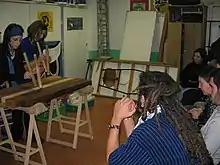 Beyond the boundaries of music, the sculptor native from Usurbil (Gipuzkoa) Jose Luis Elexpe «Pelex» has turned txalaparta into the subject of his work. Himself a pupil of the renowned txalaparta player Jexux Artze, the exhibition opened at Usurbil in May 2008 attempts to cross over the immovability of Elexpe's discipline. Besides wood, metal is used to fashion figures representing txalapartaris, as well as playing with black&white, on the one hand, and colours, on the other, to stress different approaches.[7]