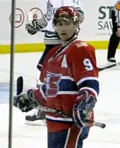 Johnson was selected by the Spokane Chiefs with their 11th-round pick in the 2005 WHL Bantam Draft.[3] In his first season with this team, in 2007–08, he appeared in 69 regular season games, scoring 13 goals and 29 assists. The Chiefs won the Ed Chynoweth Cup that season as the league's champions. The Chiefs subsequently earned a berth in the 2008 Memorial Cup, where they defeated the Kitchener Rangers by a score of 4–1. Johnson played in all 21 playoff games, scoring five goals and adding three assists. He was named the WHL playoffs' Most Valuable Player[4] as a 17-year-old rookie.
