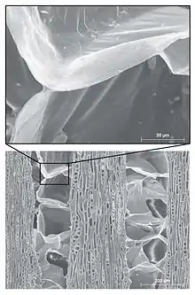 Tyloses can aid in the process of making sapwood into heartwood in some hardwood trees, especially in trees with larger vessels.[1] These blockages can be used in addition to gum plugs as soon as vessels become filled with air bubbles, and they help to form a stronger heartwood by slowing the progress of rot.[1]