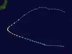 An upper-level low retrograded westward across the tropical Pacific Ocean beginning on July 4. On July 8, a tropical disturbance formed southeast of the upper low southwest of Enewetak Atoll. The system moved westward, slowly organizing. Becoming a tropical depression on July 13, the small system turned northwest, recurving gradually around a subtropical ridge to its east and northeast. The system strengthened into a tropical storm later on July 13, and a typhoon on July 14 to the south of Japan. After turning to the northeast, the system began to experience northeasterly vertical wind shear and began to weaken. After passing east of Okinawa, the system began to transition into an extratropical cyclone, a process which completed on July 17 near the southern coast of Japan.[2]