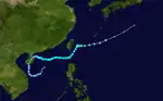 Developing in the Philippine Sea on July 30, the system developed as it moved westward, becoming a tropical storm on July 31. On August 1, its mid-level circulation center crossed into the South China Sea while its surface circulation was left behind east of the Philippines. Sarah's broad circulation center was difficult to locate until it began moving northeast east of Luzon on August 2, when it intensified to its peak intensity. As Sarah moved east of Honshu, it evolved into an extratropical cyclone.[2] Fourteen died in Japan due to Sarah.[1]