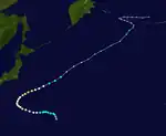 Tropical Depression 09W developed from an area of convection about 1,000 km (620 mi) to the east of Iwo Jima on July 21. Continued consolidation of its convection prompted both the JTWC to classify it as a tropical storm on 18:00 UTC.[26] The JMA followed suit six hours later and named it Kong-rey.[12] By July 23, the JTWC upgraded Kong-rey to a typhoon while the JMA upgraded it to a severe tropical storm.[12][10] A mid-latitude ridge to the east of Japan strengthened, causing Kong-rey to curve and move in a northeastward direction.[26] Kong-rey reached its peak intensity on July 25, then slightly weakened afterwards. At the same time, the JMA had finally upgraded Kong-rey to a typhoon.[12] On July 26, a redevelopment of a small eye caused Kong-rey to reach its second peak intensity for a short period of time. Its peak strength only maxed out to 10-minute sustained winds of 130 km/h (81 mph). Increasing wind shear caused the typhoon to weaken the next day. Kong-rey was downgraded to a tropical storm on 00:00 UTC of July 28.[26] Both agencies issued their final warning later that day when it had become extratropical.[12][10] Its remnants was still tracked until it reached the southwestern Aleutian Islands on August 3.[26]