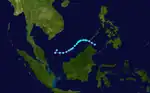 The monsoon trough produced another disturbance that upgraded into a tropical depression to the west of Luzon on June 29. The tropical depression tracked northwestward while a subtropical ridge influenced the depression and caused it to upgrade to Tropical Storm Durian on June 30.[16] The storm attained severe tropical storm status at 18:00 UTC the same day,[12] with 10-minute winds of 110 km/h (70 mph) and 1-minute winds of 140 km/h (85 mph), making it equivalent to Category 1 winds on the Saffir–Simpson scale.[16] Durian had an atmospheric pressure of 970 hPa (29 inHg).[12] Durian made landfall on the Leizhou Peninsula,[12] before rapidly weakening as it continued in the same direction before the JTWC stopped advisories of the storm on July 2,[10] with the JMA doing the same the following day.[12]