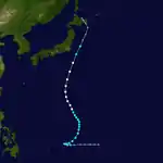 A blob of thunderstorms was noticed about 600 kilometres (370 mi) southeast of Guam on June 18. It tracked westward, without significant development until June 20 while passing south of Ulithi Atoll. Steering currents collapsed, and the system drifted between Ulithi and Yap for the next couple of days. By the morning of June 21, the system had strengthened into a tropical storm. The system drifted north to northwest, then northeast towards Guam. Ruby waited to detach from the monsoon trough before further strengthening was realized on June 23. Steady intensification ensued, and the cyclone accelerated northward, becoming a typhoon on the afternoon of June 24. Ruby became an extratropical cyclone on June 27, occluding and becoming nearly stationary east of Hokkaidō for several days.[25] Two vessels with a collective crew of 42 people became stranded off the coast of Honshu during the typhoon. The 19 crew of the No. 10 Soichi-Maru were rescued while the 23 members on the No. 8 Takojima-Maru remained missing.[26]
