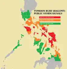 Typhoon Hagupit, also known as Typhoon Ruby, entered the PAR late on December 3, at the same time it was upgraded into a Category 5 super typhoon. With this, the NDRRMC reported that schools were suspended in the areas: Samar, Biliran and Tacloban during December 4–5.[43] On December 5, the NDRRMC had put up Signal Warnings No. 1 and 2 from the lower part of Luzon to the upper part of Mindanao. Rough seas and gale-force winds were warned over the seaboards over the eastern part of the country.[44] The Department of Health went under Code Red alert at DOH-retained hospitals in regions expected to be hit by the typhoon starting on December 6.[45] At the same time, PAGASA has put up Signal No. 3 warnings over Samar and were expecting storm surge up to 4 metres high.[46] Residents in at least 42 areas in Bicol and Visayas took precautionary measures against possible storm surge due to Ruby. As of 7:30 a.m, Project NOAH said three of the 42 are under Storm Surge Advisory (SSA) 3, 11 are under SSA 2, and the rest are under SSA 1. SSA 3 involves waves of up to four meters above sea level; SSA 2 three meters; and SSA 1 two meters.[47] It was also reported that schools and businesses were closed from December 5–6 in places in Visayas and southern Luzon.[48]