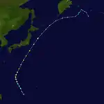 The scope of this article is limited to the Pacific Ocean, north of the equator and west of the international date line. Storms that form east of the date line and north of the equator are called hurricanes; see 1950 Pacific hurricane season. This would be the first season that Fleet Weather Center in Guam, predecessor agency to Joint Typhoon Warning Center, would take most of the responsibility in the basin, including naming the storms.[1] Before this season, the storms are identified and named by the United States Armed Services, and these names are taken from the list that USAS publicly adopted before the 1945 season started.[2][3]