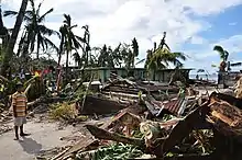 Two days after striking Chuuk, Maysak passed directly over Ulithi atoll and skirted Fais Island at peak intensity, resulting in extensive damage.[34][36] According to Guam Governor Eddie Calvo, sustained winds reached 210 km/h (130 mph) in Ulithi and 160 km/h (100 mph) on Fais,[37] with gusts reaching 240 km/h (150 mph) on Ulithi.[32] All structures on Ulithi not made of concrete were severely damaged or destroyed by Maysak's powerful winds.[38] Power and water supplies to Ulithi were completely lost during the storm.[39] The entirety of the island's crop were ruined by the typhoon's storm surge, with early estimates indicating that it would be a full year before crops could be planted again.[37] Though spared a direct hit, Yap proper was also hit hard with reports of airborne debris during the storm.[36] Outlying islands were also affected; on Faraulep, water wells were contaminated and fruit trees were knocked down.[33] During the storm, 18 fishermen were stranded Pikolot Island and West Fayew Island, but they returned home afterward.[40]