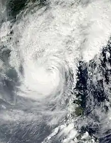 Super Typhoon Megi (pronounced [me̞.ɟi]), known in the Philippines as Super Typhoon Juan, was the strongest tropical cyclone of 2010 and is considered one of the most intense ever recorded. Megi, which means catfish in Korean (Hangul: 메기), was the only super typhoon in 2010. Early on October 18, Megi made its first landfall over Luzon.[1] By passing Luzon, Megi weakened but gradually regained strength in the South China Sea, before weakening and losing its eye in the Taiwan Strait. Megi made its second landfall over Zhangpu in Fujian, China on October 23.[2]