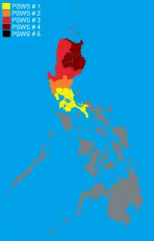 On October 17, evacuations began with hundreds of people fleeing from Luzon[45][46] as Megi intensified into a super typhoon and Storm signal number 3 raised.[47] Over 18 provinces had been placed under alert for the typhoon as it approached the Philippines.[48] Later on that day, all state schools and colleges were suspended.[49] PAGASA declared public storm warning number 4 announcing that over 7 million people were liable to be affected.[50][51] The storm warning was later raised to the highest level over Cagayan and Isabela[52] as tropical storm force winds began blowing throughout Cagayan province.[53]
