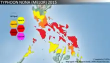 The Metro Manila Development Authority(MMDA) placed a yellow alert on Metro Manila as Typhoon Nona approached Mindoro.[37] Storm signal no. 1 was raised on Metro Manila when the typhoon neared Northern Samar.[38][39] On December 16, preschool classes were suspended on the whole region, while classes on all levels were suspended on Muntinlupa, Pateros, Taguig, San Juan, Pasay, Quezon City, Malabon, and Valenzuela.[40]