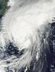 On September 28, an area of convectional cloudiness formed 370 km (230 mi) to the northeast of Pohnpei. Satellite imagery showed a Low Level Circulation Centre had begun to form. On the evening of September 28, due to a TUTT that was providing good outflow for the system and low level vertical wind shear with a favorable environment, the JTWC issued a Tropical Cyclone Formation Alert. Early on September 29, both JMA and JTWC upgraded the system into a tropical depression. Early on September 30, JMA reported that the depression had intensified into a tropical storm and assigned its international designated name, Melor. At the same time JTWC also classified the depression as a tropical storm. Early on October 1, Melor intensified further from a severe tropical storm into a typhoon. Intensification continued, and by the afternoon of the same day the JTWC reported that Melor had intensified into a Category 1-equivalent typhoon. In just four hours, it intensified rapidly to a Category 3-equivalent typhoon, and continued to track towards northeast Luzon. Early on October 2, it strengthened to a Category 4-equivalent typhoon. After levelling out in intensity, it strengthened again on October 3. Early October 4, JTWC reported that Melor had intensified to a Category-5 equivalent super typhoon, with JMA reporting a central pressure of 910 hPa and winds of 205 km/h. On October 5, PAGASA allocated the name Quedan to the typhoon as the storm moved into Philippine's area of responsibility. It interacted with Typhoon Parma in Parma's second landfall in the Philippines. By the midday of October 8, Melor made landfall on Japan.[1][2] After landfall, JMA downgraded Melor into a severe tropical storm, while the JTWC downgraded it into an extratropical storm. Late on October 11, the extratropical remnants of Melor were completely absorbed by a newly formed extratropical storm to the north, near Alaska. The new extratropical storm then strengthened into a powerful storm, which then began to impact the west coast of the United States, late on October 13.