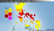 Nock-ten made eight landfalls in the Philippines.[32] According to the NDRRMC, a total of 98,771 families were preemptively evacuated in CALABARZON, MIMAROPA, Bicol, and Eastern Visayas region.[33]