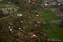 On December 25, the JTWC reported that the Dvorak technique analyses at 03:00 UTC from "all reporting agencies" indicated a T-number of 7.0;[18] therefore, the JTWC added a non-synoptic entry to the operational best track for that time, indicating one-minute maximum sustained winds of 260 km/h (160 mph), equivalent to Category 5 on the Saffir–Simpson scale.[19] However, land interaction soon impacted the typhoon, as its convective cloud tops had become warmer.[18] Later, Nock-ten made landfall over the Philippines eight times: Bato, Catanduanes at 18:30 PST (10:30 UTC) and Sagñay, Camarines Sur at 21:30 PST (13:30 UTC) on December 25; San Andres, Quezon at 02:00 PST (18:00 UTC), Torrijos, Marinduque at 04:30 PST (20:30 UTC), Verde Island, Batangas at 09:15 PST (01:15 UTC), Tingloy, Batangas at 10:10 PST (02:10 UTC), Calatagan, Batangas at 11:40 PST (03:40 UTC), and Lubang Island, Occidental Mindoro at 13:00 PST (05:00 UTC) on December 26.[20]
