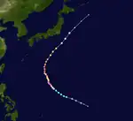On May 27, the JMA and the JTWC noted the persistence of an area of atmospheric convection about 425 nautical miles (787 km; 489 mi) south-southeast of Guam.[75] The area's nearby environment exhibited low wind shear and warm sea surface temperatures, which were ideal conditions for tropical cyclogenesis.[76] The JMA assessed the area to have developed into a tropical depression on May 29 at 06:00 UTC.[77] The PAGASA made a similar assessment in a Tropical Cyclone Advisory issued at 15:00 UTC.[78] The JTWC later followed with their own assessment, identifying the center of the newly developed tropical depression and assigning the designation 04W.[79] As the system tracked westward, it entered the Philippine Area of Responsibility at 01:00 PHT (17:00 UTC).[80] The PAGASA then named the storm Dante in its first Tropical Cyclone Bulletin for the storm.[81] Dante further organized in the Philippine Sea,[82] and on May 30 at 15:00 UTC, the JTWC upgraded it to a tropical storm,[83] with the PAGASA doing the same at 21:00 UTC.[84] On the next day at 00:00 UTC, the JMA also upgraded Dante into a tropical storm, giving it the international name Choi-wan.[85] Choi-wan's center was exposed due to a tropical upper tropospheric trough from the northeast, inducing shear on the system.[86] On June 1 at 12:30 UTC, Choi-wan made landfall on Sulat, Eastern Samar as a minimal tropical storm,[87] with the JTWC downgrading it to a tropical depression at 15:00 UTC.[88] It made a second landfall on Cataingan at 17:00 UTC.[89] Choi-wan made several more landfalls on the Philippines, making its third landfall on Balud, Masbate at 19:30 UTC. It made a fourth landfall on Romblon, Romblon on June 2 at 00:00 UTC, a fifth on San Agustin, Romblon at 00:50 UTC, a sixth on Pola, Oriental Mindoro at 06:00 UTC, a seventh on Tingloy, Batangas at 11:20 UTC, and an eighth and final landfall on the Calatagan Peninsula before moving into the South China Sea.[90] On June 3 at 03:00 UTC, the JTWC upgraded Choi-wan back to a tropical storm.[91] At 03:00 UTC, the PAGASA removed all Tropical Cyclone Warning Signals as Choi-wan moved away from the country.[92] Choi-wan then exited the PAR on June 3 at 18:00 UTC[93] before weakening into a tropical depression on the next day at 06:00 UTC and re-entering the PAR at 08:00 UTC.[94] Then, it passed southeast of the island of Taiwan[95] before moving out near the Okinawa Prefecture and heading towards Japan. On June 5 at 06:00 UTC, the Japan Meteorological Agency issued their final advisory on the system.[96] 3 hours later at 09:00 UTC, the JTWC upgraded Choi-wan back into a tropical storm,[97] however at 15:00 UTC, the Joint Typhoon Warning Center downgraded the system to a tropical depression, also issuing their final advisory on the system.[98]