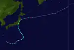 Typhoon Pat developed from the Monsoon Trough situated to the east of Taiwan on August 27. Pat quickly was upgraded to tropical storm status and was named. Due to a probable Fujiwhara Interaction between Pat and Typhoon Odessa, Pat moved toward the northeast. Just before making a turn towards the northwest Pat was upgraded to a typhoon on the 28th. Typhoon Pat began to accelerate in the direction of Japan. Pat made landfall on southern Kyūshū on the 30th before accelerating through the Sea of Japan and turning extratropical. Pat killed 23 people through Kyūshū and Hokkaidō and destroyed 3,000 homes.[13]