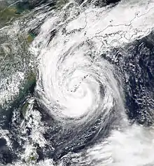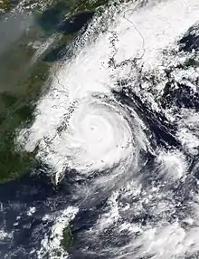 Following peak intensity, Saomai's eye became cloud-filled, and the storm began to develop concentric eyewalls.[2] Shortly after 1000 UTC on September 12, the typhoon made landfall on central Okinawa, Japan with sustained winds of 140 km/h (87 mph) and a pressure of 945 mbar (945 hPa; 27.9 inHg).[3] Saomai quickly passed over the island, and concurrently its weakening phase came to a halt. After tracking into the East China Sea, the typhoon began to track towards the northeast in response to a mid-latitude trough. At its westernmost point along its track, Saomai was located approximately 345 km (214 mi) east of Wenzhou, China. Atmospheric conditions became increasingly more hostile as Saomai tracked northeast, and the typhoon became elongated and ragged in appearance.[2] At 1200 UTC on September 15, Saomai was downgraded to severe tropical storm intensity as the cyclone began to undergo extratropical transition.[2][3] At around 2030 UTC that day, Saomai made its final landfall as a tropical system west of Pusan, South Korea;[2] after emerging into the Yellow Sea the storm was declared extratropical at 0600 UTC the next day. These remnants later tracked inland near Vladivostok, Russia before dissipating on September 19.[3]