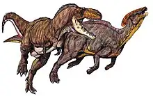 In the Dinosaur Park Formation, Gorgosaurus lived alongside a rarer species of the tyrannosaurine Daspletosaurus. This is one of the few examples of two tyrannosaur genera coexisting. Similarly sized predators in modern predator guilds are separated into different ecological niches by anatomical, behavioral or geographical differences that limit competition. Niche differentiation between the Dinosaur Park tyrannosaurids is not well understood.[109] In 1970, Dale Russell hypothesized that the more common Gorgosaurus actively hunted fleet-footed hadrosaurs, while the rarer and more troublesome ceratopsians and ankylosaurians (horned and heavily armoured dinosaurs) were left to the more heavily built Daspletosaurus.[13] However, a specimen of Daspletosaurus (OTM 200) from the contemporaneous Two Medicine Formation of Montana preserves the digested remains of a juvenile hadrosaur in its gut region.[110] Unlike some other groups of dinosaurs, neither genus was more common at higher or lower elevations than the other.[109] However, Gorgosaurus appears more common in northern formations like the Dinosaur Park, with species of Daspletosaurus more abundant to the south. The same pattern is seen in other groups of dinosaurs. Chasmosaurine ceratopsians and hadrosaurine hadrosaurs are also more common in the Two Medicine Formation of Montana and in southwestern North America during the Campanian, while centrosaurines and lambeosaurines dominate in northern latitudes. Holtz has suggested that this pattern indicates shared ecological preferences between tyrannosaurines, chasmosaurines and hadrosaurines. At the end of the later Maastrichtian stage, tyrannosaurines like Tyrannosaurus rex, hadrosaurines like Edmontosaurus and chasmosaurines like Triceratops were widespread throughout western North America, while albertosaurines and centrosaurines became extinct, and lambeosaurines were rare.[11]