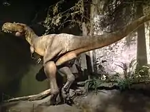 The debate about whether Tyrannosaurus was a predator or a pure scavenger is as old as the debate about its locomotion. Lambe (1917) described a good skeleton of Tyrannosaurus's close relative Gorgosaurus and concluded that it and therefore also Tyrannosaurus was a pure scavenger, because the Gorgosaurus's teeth showed hardly any wear.[124] This argument is no longer taken seriously, because theropods replaced their teeth quite rapidly. Ever since the first discovery of Tyrannosaurus most scientists have agreed that it was a predator, although like modern large predators it would have been happy to scavenge or steal another predator's kill if it had the opportunity.[125][126]