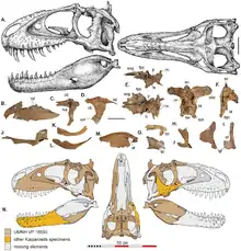 Cladistic analyses of tyrannosaurid phylogeny often find Tarbosaurus and Tyrannosaurus to be sister taxa, with Daspletosaurus more basal than either. A close relationship between Tarbosaurus and Tyrannosaurus is supported by numerous skull features, including the pattern of sutures between certain bones, the presence of a crescent-shaped crest on the postorbital bone behind each eye, and a very deep maxilla with a noticeable downward curve on the lower edge, among others.[11][17] An alternative hypothesis was presented in a 2003 study by Phil Currie and colleagues, which found weak support for Daspletosaurus as a basal member of a clade also including Tarbosaurus and Alioramus, both from Asia, based on the absence of a bony prong connecting the nasal and lacrimal bones.[19] Alioramus was found to be the closest relative of Tarbosaurus in this study, based on a similar pattern of stress distribution in the skull.