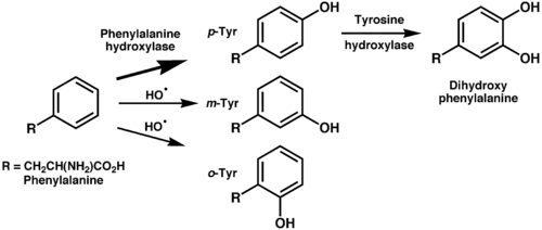 Enzymatic oxidation of tyrosine by phenylalanine hydroxylase (top) and non-enyzmatic oxidation by hydroxyl free radicals (middle and bottom).