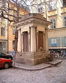 Until the early 18th century, the corner where the two streets meet was the location for a well of considerable proportions. During the later part of the century, the city's fire company established so called 'turning spaces' (spaces big enough for the turning radius of horse-drawn vehicles) at various locations to prevent throngs of people causing accidents in case of fire, and thus had a building demolished on this location in 1783 to create more space. They appointed the city architect Erik Palmstedt (1741-1803) to design the new square, its well and façades. The Neoclassical ambitions of the Gustavian architect had to be restricted in the Medieval urban landscape, which resulted in the present small-scale composition; the concave façade with its windows of various sizes acting as a scenic background for the magnificent well and its doric cast iron columns. The first synagogue in Stockholm (see Aaron Isaac) was found on the square's eastern side in the 19th century, from 1870 the location for a police station.[1][2]