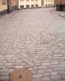 On either side of the street was the Blackfriars monastery from the 1330s to the Reformation (1520-1530). Archaeological excavations in the area have unveiled the remains of the monastery's wall under the present streets. In the southern end of Tyska Stallplan several such traces have been discovered, and in Prästgatan, south of the street, lines of cobble stones have been used to indicate the former extent of the monastery.[1]