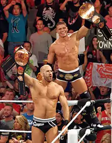 ![]() Tyson Kidd and Cesaro as the WWE Tag Team Champions in March 2015 | |
