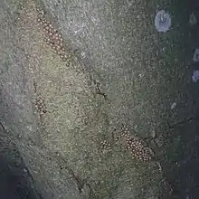 The 16-spot frequently forms very large aggregations on tree trunks, fence posts, logs and so on during winter.[7] It is a small ladybird of around 2-3mm. It is usually a cream or beige colour, although darker forms do occur. It has a distinctive dark line on the middle of its elytra, and its spots are often fused, with three fused spots often forming a line on either side of the ladybird.