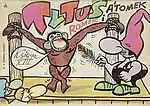 - Tytus de Zoo – a chimpanzee and the main character of the series. Tytus speaks and thinks like a human being and even attends public school together with his two human friends. However, his animal heritage clearly shines through – he is presented as wanting to attain humanity, but usually falls short during the hilarious adventures.[1] In the first story drawn by Chmielewski for the Świat Młodych magazine, Romek and A’Tomek find Tytus in a rocket (which at the time was part of the communist anti-American propaganda) as Tytus tells them he was abused by the foreign scientist. In the book version, however, Tytus came to life from a blot of ink the creator Papcio Chmiel accidentally spilled on the floor (this unusual origin fits the slightly surrealistic nature of the books). Tytus, however, many times mentioned (as well as visited) his "homeland" Trapezfik[4] (which is a reference to Tytus' love for physical activity and Polish wordplay of "trapeze" and "tumble").