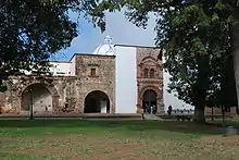The main attraction of the modern town is the former monastery complex of San Francisco, which was founded in the 16th century.[9] The complex was designed and initiated in 1530 by Spanish architect (and Franciscan friar) Fray Pedro de Pila.[10] The complex contains the Church of San Francisco, the Church of La Soledad, two open chapels and a large atrium,[9] with much of the building material obtained from the nearby yacata pyramids that the Spanish destroyed.[11] The Church of San Francisco is the first built and still conserves the arch that separates the presbytery from the nave, which was the original portal of the 16th century. Next to this portal is a small open chapel from the same time period. There is a plaque on this open chapel that states that it stands on the site of the first Mass to be celebrated in Michoacán.[9] Inside the Church of La Soledad is the "Santo Entierro", which is a wax figure of Christ displayed in a glass coffin. It is believed (by Mexican folklore) that the arms and legs of this statue are growing. One end of the coffin has an extension added for the feet, with the toes reaching the glass end. Inside the coffin are U.S. and Mexican currency.[12][13]
