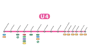 The U4 is a service on the Frankfurt U-Bahn. At the time of the services's inauguration in 1980, it ran from the central railway station to the Konstablerwache and then continued along the Berger Straße all the way up to Seckbacher Landstraße in Bornheim, making it the first service to run entirely underground over its total length. In 2001, the U4 was extended from the central railway station to Bockenheimer Warte, with an additional stop at the Frankfurt Trade Fair along the way. In 2008, some of the trains started continuing past Seckbacher Landstraße to Schäfflestraße and then overground to Enkheim together with the U7.