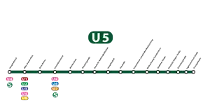 The U5 is a service on the Frankfurt U-Bahn. At the time of the services's inauguration in 1974, it ran from the central railway station to the Konstablerwache and then continued along the Eckenheimer Landstrasse all the way up to Preungesheim. After Konstablerwache the line is running above the ground towards Preungesheim. Until 2016 PTB cars were used as there were street level stations. In late 2016 two stations were retrofitted with high-level platforms, and the other two closed, letting the high floor U5 class operate.
