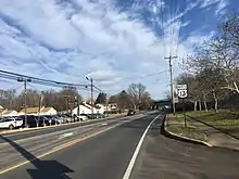 Following this intersection, the route enters the borough of Bristol and widens into a four-lane divided highway with multiple intersections controlled by jughandles, heading northeast through business areas further from the railroad tracks and crossing Mill Creek. The road briefly passes through Bristol Township as it heads south of Silver Lake and curves northeast. US 13 continues through the northern part of the borough of Bristol, running through commercial areas and passing to the west of residential neighborhoods. The route reenters Bristol Township upon crossing Adams Hollow Creek and passes through commercial areas with some woods before coming to an intersection with a ramp that provides access to the Pennsylvania Turnpike (I-95) at an interchange. Past this ramp, the road passes through commercial areas and crosses an East Penn Railroad line at-grade before passing under the Delaware River–Turnpike Toll Bridge which carries I-95 over the Delaware River. US 13 crosses the Delaware Canal and runs past more businesses. The route crosses into the borough of Tullytown and passes between the Levittown Town Center shopping center to the west and Levittown station serving SEPTA's Trenton Line on the adjacent Northeast Corridor to the east.[2][5]