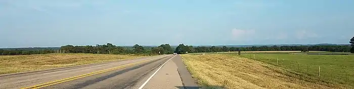 As US 175 comes into Kaufman County, the surroundings become more rural. The freeway descends into a river valley and wetlands area,[8] and then crosses the East Fork of the Trinity River. This marks the city limit boundary between Seagoville and Crandall.