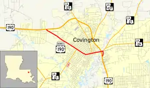 U.S. Highway 190 Business (internally known as U.S. Highway 190-X[1]) is a 3.31 mile (5.88 km) business route of US 190 in Covington, Louisiana.[2][3] It is known locally as 21st Avenue and Boston Street. The route is primarily used to access southbound Louisiana Highway 21 (LA 21) and Covington's business district. It also is Covington's road grid divider between north and south for a part of its length.