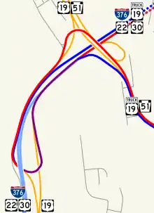 U.S. Route 19 Truck (US 19 Truck) is a truck route of US 19 located in Western Pennsylvania in Greater Pittsburgh that has a length of 19.4 miles (31.2 km). It is a loop off US 19; the southern terminus located in Mt. Lebanon and the northern terminus in McCandless, connecting to US 19 at both ends. The route is notable for a large, unorthodox interchange with the Penn–Lincoln Parkway (Interstate 376 [I-376]/US 22/US 30) just west of the Fort Pitt Tunnel, where the route joins the parkway and forms several wrong-way concurrencies, including one with its own opposing directions.[2] North of Pittsburgh, US 19 Truck is called McKnight Road and south of Pittsburgh it carries West Liberty Avenue and Washington Road.