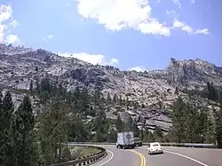 The Lincoln Highway, one of the earliest marked highways across the country, split in two over the Sierra Nevada. The main route followed the present I-80 alignment over Donner Pass, but an alternate "Pioneer Branch", designated as part of the initial routing in 1913, turned south at Reno, Nevada to Carson City and then crossed the Sierras via Johnson Pass and the Placerville route. Contrary to the Lincoln Highway Association's policy of marking the most direct route, this deviation was explained simply as "for those tourists desiring to see Lake Tahoe". However, it actually became shorter in 1921, when the Fallon Cut-off opened from Carson City directly east to the main route near Fallon, bypassing Reno.[46] The U.S. Highway system was created in 1926, and this route (along with the main Lincoln Highway east of the cutoff) became part of U.S. Route 50. (The Donner Pass route was U.S. Route 40, crossing Nevada on the Victory Highway.) US 50 initially ended in Sacramento, where motorists could follow US 40 (Victory Highway) southwest to the San Francisco Bay Area or turn south over US 99 to Stockton and take US 48 (Lincoln Highway) west over Altamont Pass. Originally, US 48 was a road connecting the San Francisco Bay area with the San Joaquin Valley, traveling from San Jose to near Modesto, largely following the future routing of US 50, which replaced US 48. Its western terminus was located near the present location of the Interstate 238/Interstate 880 interchange. It generally followed the route of current Interstate 580 to the Interstate 205 junction. From here, US 48 continued east on Interstate 205, then followed Old Highway 50 (present I-205 Bus.) through Tracy, thence to Interstate 5. It then followed Interstate 5 to SR 120, where US 48 followed SR 120 to the old location of the SR 99/SR 120 interchange (present day intersection of Main and Yosemite in Manteca), the location of its eastern terminus. [47][48] At this time, US 50 was improved but unpaved east of Placerville.[49] As part of the state project to pave this portion, the old road was bypassed in several areas, completing the final two-lane alignment. These realignments included Broadway, bypassing Smith Flat Road, at Smith Flat (1932), a new route around Slippery Ford Grade east of Strawberry (1931), and a new route through South Lake Tahoe, leaving behind Pioneer Trail (1931). The crossing of the Sierra crest at Johnson Pass was bypassed in 1940 by a better-quality route over Echo Summit; the lower part of the current road east of the summit opened in 1947, bypassing Meyers Road.[26] West of Placerville, several major two-lane relocations were built. A bypass (now Mother Lode Drive) around El Dorado and the winding Forni Road was completed in 1938, and the improvement was extended west to Shingle Springs in 1947. A short relocation north of White Rock, between Bidwell Street and Bass Lake Road, opened in 1940, and was extended west beyond Hazel Avenue, bypassing Folsom, in 1949.[50][51][52]